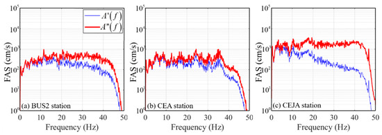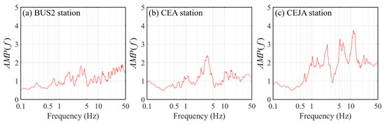 where , , and are the 5% damped pseudo spectral acceleration (PSA) from the East–West, North–South, and Vertical components of ground motions, respectively. Figure 3 shows the calculated site amplification factor function estimated from the ground motions recorded at stations BUS2, CEA, and CEJA during the 2017 Pohang earthquake. This function was applied to the Fourier spectrum of a ground motion at each frequency. Figure 4 shows the ground acceleration time histories and Fourier spectra before and after applying Equation (1).