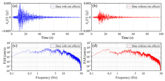 Ground motion recorded at station BUS2 with and without site effects: (a) Ground motion acceleration with site effects, (b) Ground motion acceleration without site effects, (c) Fourier amplitude spectrum with site effects, (d) Fourier amplitude spectrum without site effects.