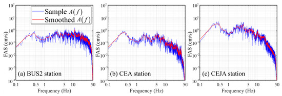 To effectively determine the values for , , and , the of the recorded ground motions were smoothed using a technique proposed by Konno and Ohmachi [21]. Figure 5 shows the original and smoothed of ground motions recorded at three sample stations (BUS2, CEA, and CEJA) during the 2017 Pohang earthquake.