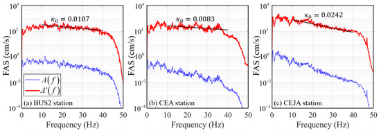 Previous studies [9,26,27,28] estimated and by using the omega-square model proposed by Brune [18,19] based on the FAS of the recorded ground motions. To determine and without interaction with site attenuation (), the Fourier amplitude spectrum without the effect of [] was calculated using Equation (4). Figure 7 shows and .