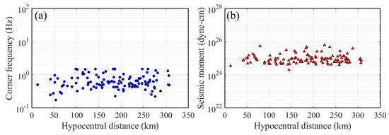 Distributions of the values of and , according to hypocentral distance: (a) Measured corner frequencies at 111 stations, (b) Measured seismic moments at 111 stations.