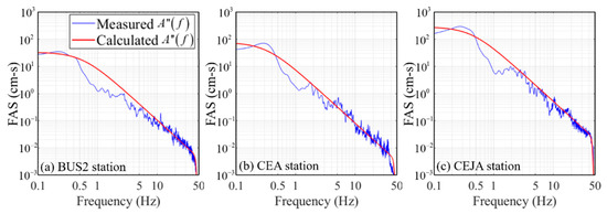 Measured and calculated Fourier amplitude spectrum (FAS) at three sample stations: (a) BUS2 station, (b) CEA station, (c) CEJA station.