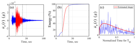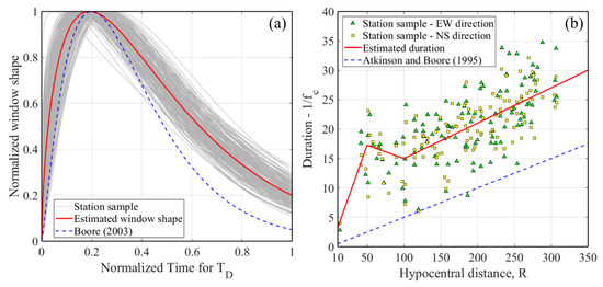 where is the time, and is the duration time. The duration time is calculated from the S-wave arrival time to the time corresponding to the 95% normalized arias intensity energy (). is estimated using Equation (11).