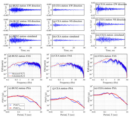 Recorded and simulated ground motion at sample stations: (a) BUS2 station-EW direction, (b) BUS2 station-NS direction, (c) BUS2 station-simulated, (d) BUS2 station-FAS, (e) BUS2 station-PSA, (f) CEA station-EW direction, (g) CEA station-NS direction, (h) CEA station-simulated, (i) CEA station-FAS, (j) CEA station-PSA, (k) CEJA station-EW direction, (l) CEJA station-NS direction, (m) CEJA station-simulated, (n) CEJA station-FAS, (o) CEJA station-PSA.