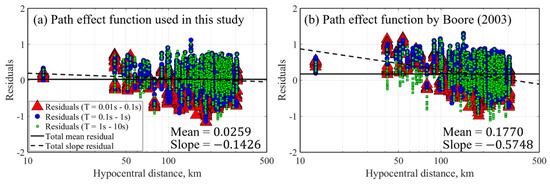 If the path effect function proposed by Boor (2003) is used in the numerical model, the mean residual deviates from zero, as shown in Figure 13b. The degree of deviation varies according to the period. In the case of using the source function and site amplification function proposed by others when simulating ground motions with the proposed numerical model, similar observations were made, which are not included in the paper.