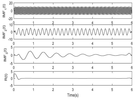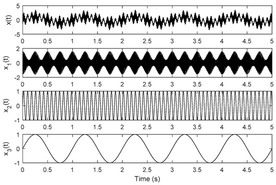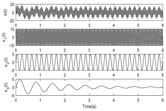 where t [0, 6], the setting sampling frequency 1000 Hz, and the simulation signal consists of a modulated signal and two sine signals. The time-domain waveforms of x(t) and its three components x1(t), x2(t), and x3(t) are shown in Figure 6.