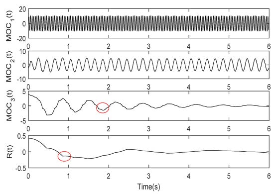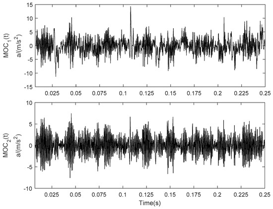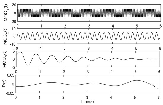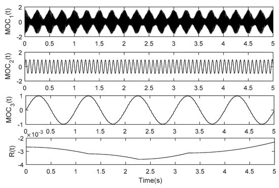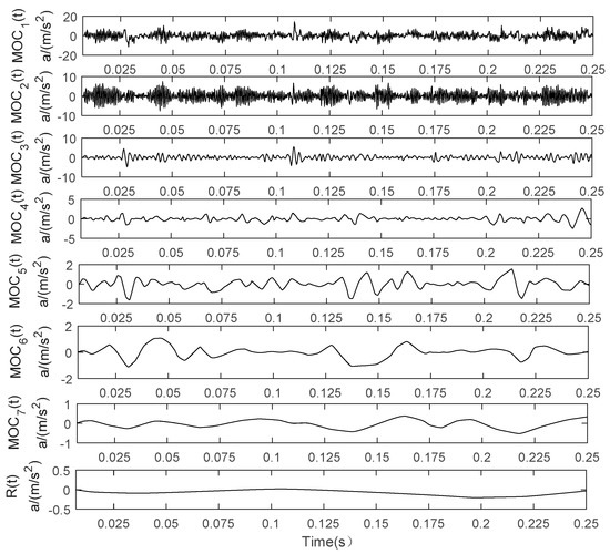 The vibration signal shown in Figure 11 is decomposed by the RS-LOD method. The value of the pole parameter p will affect decomposition results and decomposition time; therefore, we need to determine the value of p firstly. Table 2 shows the number of sifts required to identify each MOC. It can be seen that the number of sifts required for each MOC component and the total number of sifts for per decomposition for a range of p values. When p takes relatively smaller value at a certain range, the total number of sifts required is less, and the number of MOCs obtained is also less. From these two standards, when p takes the range of 0 to 10, it is possible to get higher decomposition efficiency.