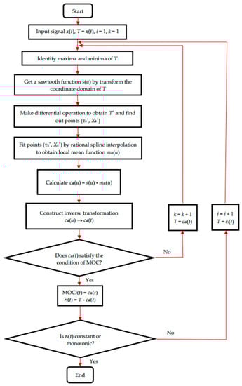Rotating machinery, such as gears and rolling bearings, is an important component of mechanical equipment whose fault will have a serious impact on the safe operation of the mechanical device. Therefore, it is of great significance to realize real-time online monitoring of the running condition of rotating machinery [1]. When rotating machinery breaks down, its vibration signals are usually nonlinear and non-stationary. Consequently, traditional time-domain or frequency-domain analysis methods are not suitable for the direct analysis of these signals [2]. The time-frequency analysis method is often used to extract the fault features of the vibration signals of rotating machinery because it can provide both the time-domain and frequency-domain information of signals, and has been adopted to solve multiple fault diagnosis problems [3,4]. However, classic time-frequency analysis methods have the inherent limitation of insufficient self-adaptability. Considering short-time Fourier transform (STFT) as an example, the time-frequency structure no longer changes once its window function is fixed [5]. Another example is the wavelet transform (WT), whose basis function and time-frequency structure are also fixed and are not self-adaptive in nature [6]. As real self-adaptive time-frequency analysis methods, empirical mode decomposition (EMD) [7] and local mean decomposition (LMD) [8] can decompose a multi-component amplitude-modulation and frequency-modulation (AM-FM) signal into a plurality of single-component signals and a residue in a self-adaptive manner, and therefore, they have been extensively applied [9,10,11,12,13,14]. However, there are still some theoretical limitations with these two methods. For EMD, these problems include the end effects [15], over- and undershoot [16], mode-mixing [17], and unexplainable negative frequencies generated by the Hilbert transform [18]. For LMD, the use of a moving average to derive the local mean function and the envelope estimation function leads to a large amount of calculation. In addition, the selection of moving step lengths is subjective, where wrongly selected step lengths will lead to a poor decomposition outcome [19], and local mutation and other problems may occur to a pure FM signal obtained by means of the division [20].