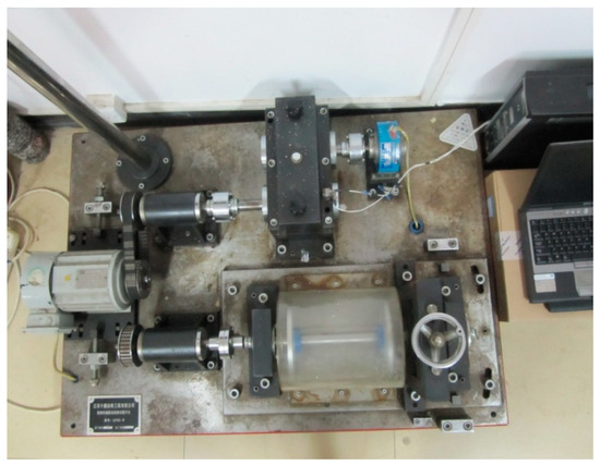 In order to verify the proposed method, the rolling bearing failure experiment was carried out on a rotating machinery fault test bench. The top view of the experimental device is shown in Figure 10. The adjustable speed motor in this system is a DC servo motor with a power of 600 W. The rolling bearings are installed on four bearing chocks, and both driving gear and driven gear are spur gears. The moment of the inertia of the load is 0.03 kg·m2. In this experiment, the tested bearing is the 6311-type rolling bearing, which was formed the inner-race and outer-race faults by laser cutting technology, and the slot width and depth are 0.15 mm and 0.13 mm, respectively. The vibration signals are collected by two piezoelectric acceleration transducers, which are horizontally and vertically fixed to the bearing housing. Figure 11 shows the time-domain waveform of vibration acceleration signal of the rolling bearing with outer-race fault. The sampling frequency is 4096 Hz, and the rotating frequency is fr = 25 Hz, and by calculating the outer-race fault characteristic frequency is fo = 76 Hz.