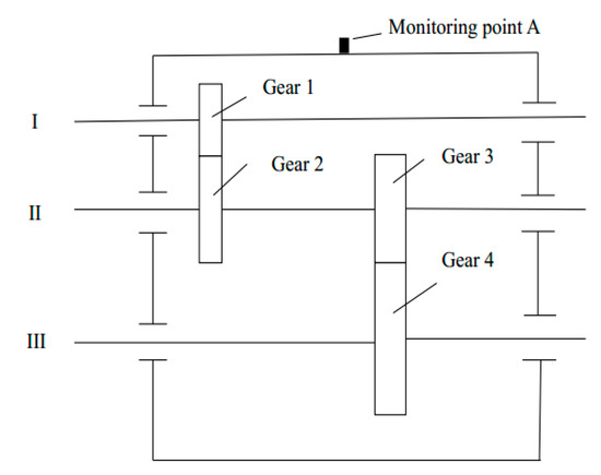 Figure 15 shows the structure of the No.3 fan gearbox of a petrochemical company, in which the teeth number of gears 1, 2, 3, and 4 are 11, 31, 23, and 53, respectively. The rotational speed of shaft I is nI = 980 r/min, namely, the rotating frequency of shaft I is about fI = 16.3 Hz, the rotating frequency of shaft II is about fII = 5.8 Hz, and the rotating frequency of shaft III is about fIII = 2.5 Hz. One day, the online monitoring system found that the vibration of the no.3 fan gearbox was abnormal. The root means square value of the vibration acceleration signal (on monitoring point A shown in Figure 15) was relatively bigger than the threshold value, but the fan running was not affected, and the date was close to the normal shutdown maintenance date, so keep observation. During the subsequent shutdown maintenance, the fan gearbox was examined. It was found that four gears of gearbox had different degrees of wear and tooth surface glue, especially the wear of gear 1 and gear 2 were very serious, which can be shown in Figure 16.