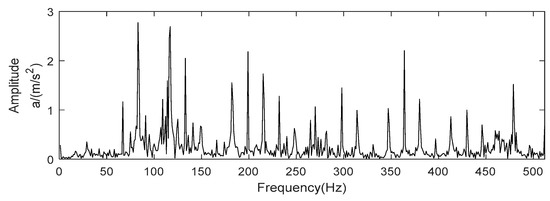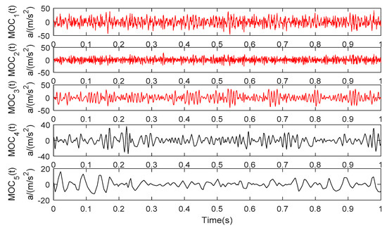 In order to verify that Hilbert envelope spectrum based on RS-LOD can accurately identify the fault condition of the gearbox, a vibration acceleration signal (the sampling frequency is 1024 Hz) measured on the same day is selected for analysis, and which time-domain waveform and amplitude spectrum are as shown in Figure 17 and Figure 18. By preliminary analysis, the main frequency components include the mesh frequency of gear 1 and gear 2, the mesh frequency of gear 3 and gear 4, and many other unknown frequencies. Moreover, the sidebands of the gear mesh frequency are very difficult to distinguish. Therefore, it is hard to estimate whether and where the fault has occurred in the gearbox from the amplitude spectrum in Figure 18. Further, the envelope demodulation technology based on the RS-LOD is used to identify the condition of the gearbox. According to the manner in Section 5.1, we can determine the value of p in this decomposition is 9. A total of ten MOC components are obtained by RS-LOD decomposition, and the first five MOC components are shown in Figure 19. It can be seen that the decomposition effects are good, and there are no obvious distortions. The first three MOC components are further selected for Hilbert envelope analysis, and the results are shown in Figure 20, respectively.