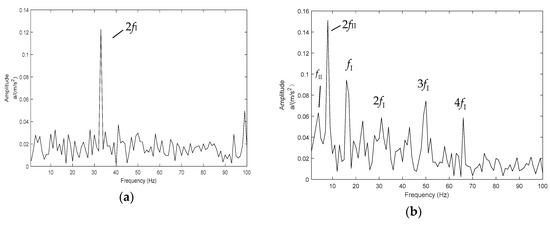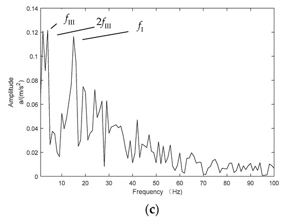 In Figure 20a, it can be seen that there is a spectral line with high amplitude at the double frequency of rotating frequency fI. In Figure 20b, there are several obvious spectral lines, which at the 1, 2, 3, 4 times of rotating frequency fI, and at the 1, 2 times of rotating frequency fII. In Figure 20c. It can be seen at the rotating frequency fI and 1, 2 times of rotating frequency fIII there are clear spectral lines. According to the distribution and amplitude of above spectral lines, it can be determined that there are certain degree faults in all four gears on three shafts, and the faults on gear 1 and gear 2 are more serious, while the faults on gear 3 and gear 4 are relatively slight. It is consistent with the actual gearbox check, which confirmed the effectiveness of the proposed diagnosis method.