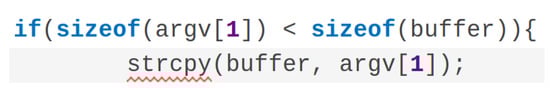 - Larochelle, D.; Evans, D. Statically detecting likely buffer overflow vulnerabilities. In Proceedings of the 10th USENIX Security Symposium, Washington, DC, USA, 13–17 August 2001. [Google Scholar]