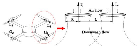 Compared with the isolated rotor, the intensity of aerodynamic interference between the adjacent rotors is determined by the rotor spacing. Considering that the interference is mainly caused by the rotor wake and interactions between the downwash flows, the stability and flight efficiency of the quadrotor is challenged in hover. Figure 1 shows the aerodynamic interference model of micro quadrotor aircraft.