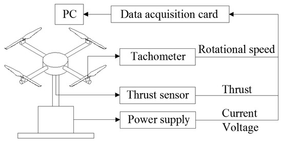 In Figure 3, the rotor was driven by DC brushless motors (model: EM2835), the rotational speed was read by the tachometer (model: UT371, accuracy: (±0.04% ± 2 d)), and the thrust is measured by the thrust sensor (model: CZL-605, accuracy: 0.02% F.S). Additionally, all the measurements were recorded by a data acquisition connected to a computer. The experimental structure is simple without the redundant devices, all the hardware, software, and procedures were designed to ensure that high-quality, consistent data is being acquired which showed the ability to provide high quality repeatable data [19]. The detailed experimental procedure is given as follows: (1) Calibration for thrust sensors to avoid any changes in the calibration factors produced by preloading of the structure. (2) With the rotor running, 4 s of data were acquired from the transducers at a rate of 1000 samples/s from each transducer, and the values averaged to eliminate unsteady effects. (3) Each measurement run was repeated from 3 to 5 times, until the scatter in the measurements fell to acceptable levels. (4) The measurement values of the test variables from each run were converted into their non-dimensional coefficient forms to obtain the uncertainty in the value of the coefficient for that run.