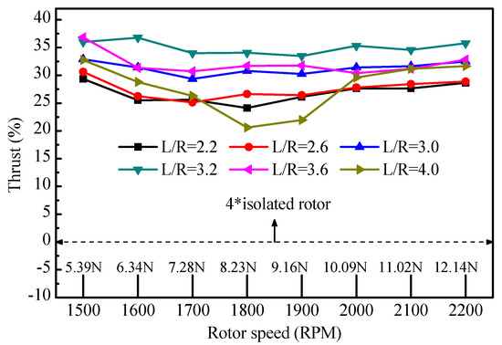 It can be seen that the thrust of the quadrotor with different spacing is obviously higher than that of the four isolated rotors. Additionally, it is can be found that the thrust increment is relatively small when the rotor spacing is too small or too large. Additionally, it can be speculated that the strong aerodynamic interference or almost no interference between rotors will cause a loss of thrust for the quadrotor. Therefore, appropriate rotor spacing may reduce the aerodynamic interference between adjacent rotors, and also increase the thrust of the quadrotor. Actually, the quadrotor can obtain larger thrust at L/R = 3.2 and L/R = 3.6, where the largest thrust increment is 36.8% for L/R = 3.6 at 1500 RPM.