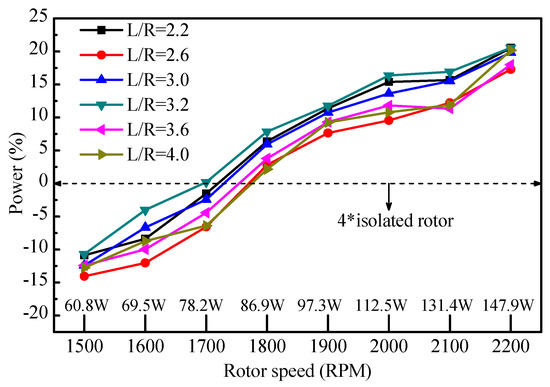 As showed in Figure 5, the power of the quadrotor increases gradually with rotational speed. When the rotational speed is lower than 1700 RPM, the power consumption of the quadrotor is smaller than that of the four isolated rotors. Combined with the Figure 4 and Figure 5, it can be found that although the quadrotor can obtain greater thrust at L/R = 3.2, it needs to consume more power compared with other rotor spacings. For the rotor spacing at L/R = 3.6, the quadrotor obtained a smaller power consumption with a larger thrust level.
