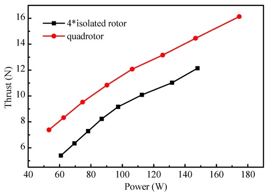 It can be found that the thrust increases obviously with power, and the thrust of the quadrotor is much higher than that of the four isolated rotors with the same power consumption, which shows that moderate aerodynamic interference between rotors can effectively improve the thrust and obtain a better aerodynamic performance for the quadrotor.