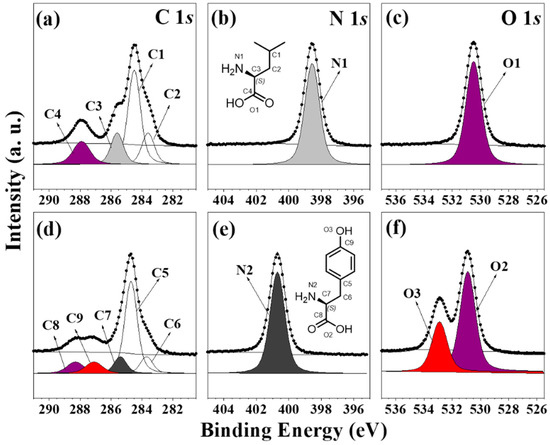Concurrently, the changes in the N 1s and O 1s core-level spectra at the ~0.20 ML level of coverage were determined using the same methods for the two amino acids adsorbed on the Cu(110) surface. The N 1s core-level spectrum of ~0.2 ML Leu on the Cu(110) surface in Figure 2b showed a single peak at 398.5 eV (marked as N1). Considering the binding energy, N1 was assigned to the neutral N atom in the Leu molecule [20,21,22]. The N 1s core-level spectrum obtained for ~0.20 ML Tyr adsorbed on the Cu(110) surface, as in Figure 2e, also showed a single peak, but at 400.5 eV. This result was indicative of the N-dative bonding structure for the adsorbed Tyr.