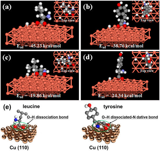 In contrast to the case of Leu, the O–H dissociated-N dative bonded structure, containing a charged N and calculated using DFT, was found to be the more stable structure for Tyr on Cu(110), with an Eads of −38.76 kcal/mol, rather than the O–H dissociation bonded structure, with an Eads of −24.34 kcal/mol, as seen Figure 3b,d. These results clearly show the O–H dissociated-N dative bonded structure to be preferred for the adsorption structure of Tyr. Additionally, clear illustration of the difference for the O-H dissociation bonded structure of Leucine versus the O-H dissociated –N dative bonded structure with a charged N for Tyrosine was shown in Figure 3e.