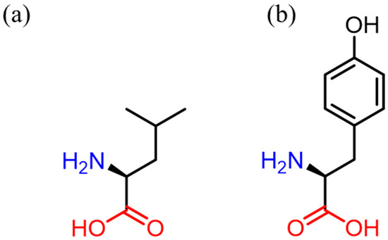 Molecular structures of (a) leucine and (b) tyrosine.