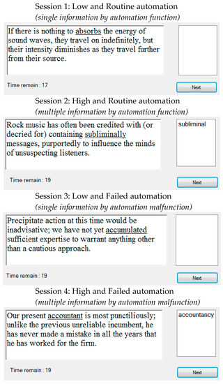 Automation in this study was provided for performing proofreading, which is one of the most common types of automation experienced in word-processing. The participants were required to identify and correct typographical errors in a sentence. Generally, the automated proofreading function is already embedded in several word processors. Five proofreading tasks, similar to the AutoCorrect feature in Microsoft Word, including one non-automated and four automated proofreading tasks, were developed with a custom-built software program using Visual Studio 2016 (see Figure 1). In the non-automated task, the participants were asked to manually identify a typographical error in a sentence. The automated proofreading tasks were developed at two levels (i.e., Low and High) of automation and two statuses (i.e., Routine and Failed automation). At the Low automation, only an underlined word was provided to the participants, and, at the High automation, an underlined word was provided along with a substitute (e.g., “subliminal” and “accountancy” in Figure 1). The Routine automation status indicates that the underlined word is grammatically incorrect (e.g., “absorbs” and “subliminal”). On the other hand, Failed automation status indicates that the underlined word is grammatically correct (e.g., “accumulated” and “accountant”). Note that the substituting words in Session 4 (e.g., “accountancy”) are grammatically incorrect and represent High and Failed automation.