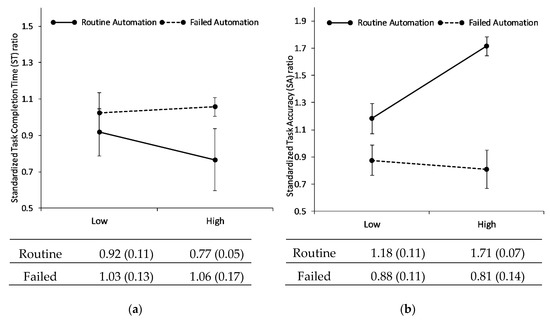 We measured task performance by standardized task completion time (ST) ratios and standardized task accuracy (SA) ratios. If the ST ratio is greater than 1, the automation is considered as having lengthened the task completion time; and if it is less than or equal to 1, the automation is considered as having accommodated the task completion time. Similarly, if a SA ratio is greater than 1, the automation improves the task completion accuracy; and if it is lower than or equal to 1, the automation causes more errors and deteriorates the task accuracy.