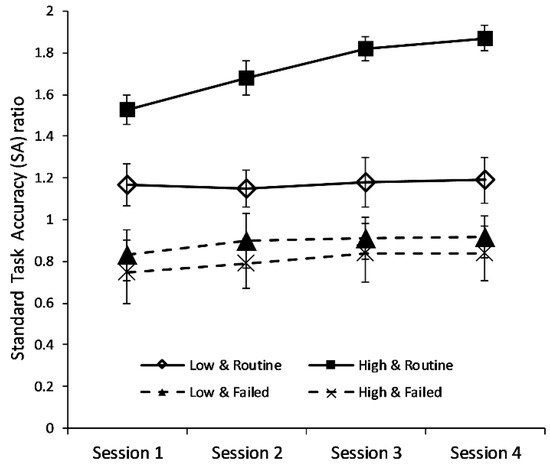 Longitudinal performance changes were examined for ST and SA ratios, as shown in Figure 3 and Figure 4, respectively. These figures demonstrate how the users adapted to Routine and Failed automations over a prolonged period. As a result, except for SA ratios in High and Routine automation, no significant performance changes were observed. An ANOVA on SA ratios in High and Routine automation yielded a significant difference among sessions, F (3, 42) = 4.29, p < 0.05. A post-hoc test showed that SA ratios in the session 1 and in the session 4 differed significantly at p < 0.05. In addition, we could confirm that there was no longitudinal difference in statistically similar performances in Failed automation.