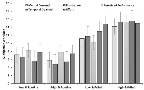 The evaluation of the subscales showed patterns different from the overall workload (see Figure 5). The effects of automation statuses were notable, while the effects of automation levels were mixed. Only perceived performance (F (3, 187) = 5.26, p < 0.001) and frustration (F (3, 187) = 11.879, p < 0.001) demonstrated significant effects of automation levels, while for the mental demand (F (3, 189) = 2.88, p = 0.698) and time demand (F (3, 189) = 2.78, p = 0.708) subscales, the automation level did not impact the measurements in Failed automation. Similarly, for the effort subscale, the participants did not recognize the effect of automation level in both Routine and Failed automations (F (3, 189) = 2.82, p = 0.703; F (3, 189) = 2.88, p = 0.698).
