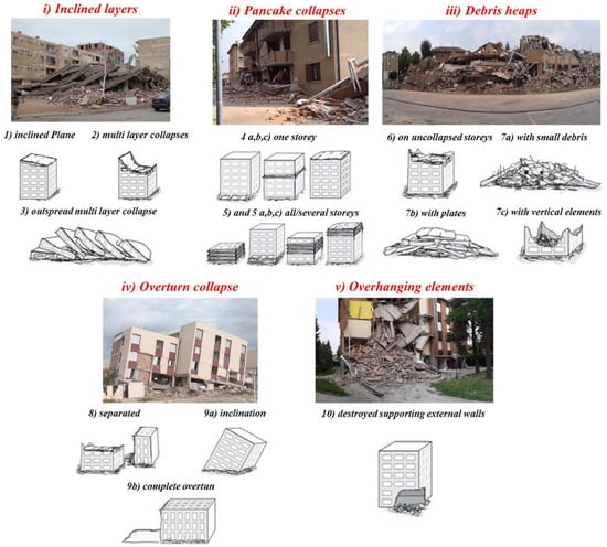 Analyzing the collapsed buildings triggered by the earthquakes that occurred between 1988 and 2003 in Algeria, Armenia, India, Japan, Mexico, Romania, Taiwan and Turkey, researchers [5] considered ten different damage types categorized into the following five groups (Figure 2): (i) inclined layers; (ii) pancake collapses; (iii) debris heaps; (iv) overturn collapses; and (v) overhanging elements.