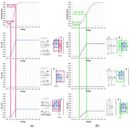 According to the current Italian seismic code [15] (NTC 2018 hereafter), in the event of an earthquake, any building meeting the operative limit state (OLS) is considered to have no damage to its structural elements and only minor damage to its non-structural elements. Therefore, for this damage state, the building should not suffer significant damage, so as to produce appreciable debris on the road. Consequently, consistent with Table 1, for each IM in which DF ≤ 7%, the structure retains its footprint area (Af), and the debris width can be assumed equal to zero (wd = 0). For damage beyond the OLS, the structure instead has a different behavior.
