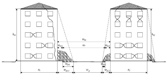 where wd,2 describes the case in which the debris distribution, which does not affect the analyzed road network segment. For the collapsed building in two directions, the relevant wd can be calculated as follows: