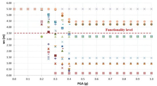 As shown in Figure 5, by applying Equation (10) for each IM considered, it is possible to identify the total number of analysis points and the number of points where the width of the road pavement is reduced beyond the 3.50 m (wfr ≤ 3.50 m), required for the passage of emergency vehicles (number of closures or collapses). In particular, for these closures or collapse points, the required performance level can be defined through the width of the debris heap on the road pavement (wdr), which can assume the following values: