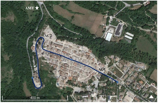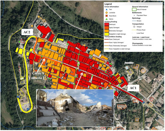 The seismic events that affected Central Italy in August and October 2016 are among the strongest earthquakes that have happened in that area. Due to the seismic events of 24 August, Amatrice suffered the most extensive in terms of casualties and damage to structures, while the October earthquakes did not cause casualties, because people were already evacuated from damaged houses due to previous seismic events. Based on a field survey performed in Amatrice on 12 September 2016, several authors [20] developed a detailed map of the damage distribution resulting from the seismic events of 24 August. According to these authors, during the first seismic event (the main shock at 3:36 a.m.), the accelerometric station located in the municipality of Amatrice (AMT) recorded a PGA of 0.87 g along the EW component. The AMT seismic station was located at approximately 450 m from the town center and 8.5 km from the epicenter. It was therefore very close to AC1 and AC2 (Figure 11) and consequently, the same IM levels could be considered in the analysis. The map shown in Figure 12 was elaborated from satellite images taken on 25 August [25]. Consistent with the aforementioned authors [20], it shows that along Corso Umberto I, numerous buildings were damaged or collapsed, which caused the complete blockage of AC1 and AC2.