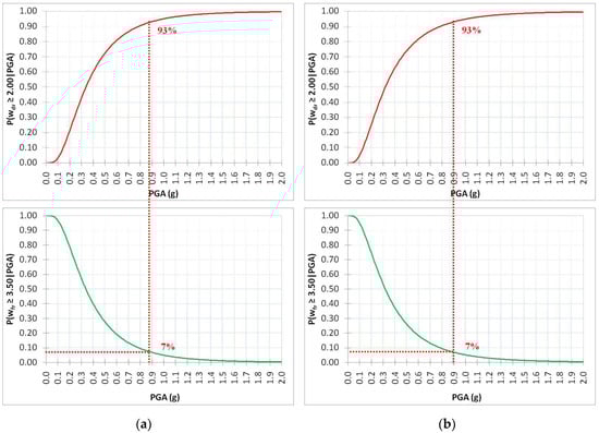 Taking into account the geometric characteristics of AC1 and AC2 and comparing the debris graphs (18 diagrams for each side of the road), using Equation (10), 324 wfr values (number of analyses) were calculated for each IM. Considering the number of points for which wfr ≤ 3.50 m (or wdr ≥ 2.00 m), the number of closures or collapses was identified for each IM. Based on the number of analyses and closures or collapses identified for 0.1 g ≤ IM ≤ 0.5 g (region of the fragility curve most important for risk assessments), using a simple software tool [19] to solve Equation (13), the fragility curve parameters were estimated for AC1 and AC2. Figure 9 shows the fragility curves of the analyzed infrastructure with the relevant construction points. Finally, using Equation (14), the probability that the road was open for the passage of emergency vehicles after debris fall could be defined for each IM (Figure 10).