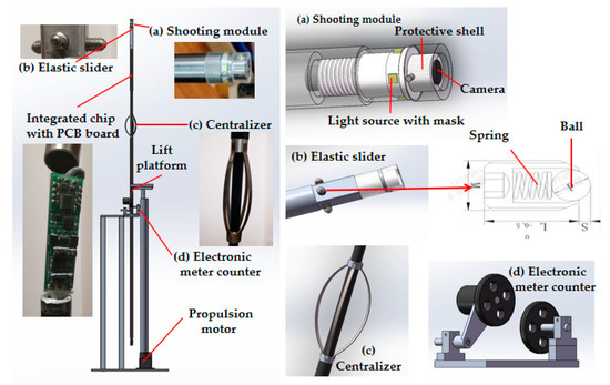 To ensure the speed of shooting and avoiding overlapping when obtaining the field of view of each frame, we adopted the method of direct shooting. With a fixed-speed propulsion device, we could quickly and accurately obtain the hole-wall information of the field of view of the front view. Based on the shooting principle of a CCD HD-2M camera (Imperx, Boca Raton, FL, USA), the corresponding sizes of pixels at different positions in the field of view were deviated. The exposure curve will also be distorted due to the different distances from the light source. Using the nonlinear fitting features of the neural network and our homemade feature stickers, we trained a visualization network to achieve radial distortion correction of the in-hole wall-facing image to become a plane image. In order to shoot effectively, we made a corresponding hardware system. With a large amount of calibrated data, the training model had a higher objectivity than a single subjective discrimination. To ensure that the probe rod entered the probe site at a constant speed, a lifting and limiting mechanism was designed. Figure 1 shows the overall and partial introduction of the hardware of our entire system. To consider the actual size relation of each pixel in the image and prevent large errors in the process of the distortion correction, we used a constant-speed propulsion device to propel the whole system. In order to keep the whole system stable, we designed two kinds of stabilizing devices, as shown in Figure 1. An H1S2T motor (NiMotion, Beijing, China) was used to push the screw and drive the lifting platform to feed the test rod evenly. A 485 transmission protocol was adopted for coordinate and visual signal modulation of this system, which was conducive to long-distance transmission. Figure 2 shows a schematic diagram of the actual operation of the system.