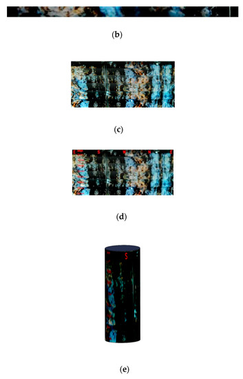 In part one, to ensure that the up-sampling in the distortion correction process could accurately restore the detailed information of the hole wall in the elevation diagram, we used the depth concatenation mechanism [18,19]. In the second part, we used the confidence analysis of the patch and the data guidance mechanism of the ground truth to quantitatively analyze the direction and confidence level of the crack. Figure 3 shows the schematic diagram of the image reconstruction of the rock pattern wallpaper on the inner wall of the microsplit cavity.