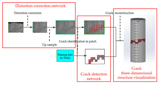 Because the environments of most deep ground water pressure crack stress detection methods are very narrow and the camera field of view is also very narrow, there is an urgent need for the fast processing of small field images, as well as a detection method. Our network structure is divided into two parts: the front part is the mapping reconstruction network that is used to solve the distortion; and the back part is the detection network for the identification and crack splicing. Using information from LPMS-ME1 IMU (Alubi, Guangzhou, China), we spliced the coordinates of the pipe cracks with corresponding frames in the time and spatial dimensions. We spliced them with patches and finally formed a 3D system for flaw detection and crack trajectory generation. In order not to be disturbed by the magnetic field, we shielded the magnetic field information in the Kalman filter [17]. Because crack detection itself is a classification problem, after traversing using a patch mechanism, we evaluated its quality with a specific ground truth and finally got the system to accurately identify the crack trend.