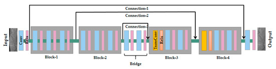 The input image size of our system was 408 × 568. All the network structures in this system were determined through the tradeoff between accuracy and speed. The first layer was a convolution layer that filtered the input with 64 kernels and each filter was of size 7 × 7 × 1. The output image, which was as large as the input image, could be obtained using the transposed convolution decoding region [21]. The structure of the network is shown in Figure 5. The method of skipping connections could be simply realized with backpropagation without gradient vanishing. Although models with a higher resolution may lead to higher simulation accuracy, a longer computation time is required. Table 1 shows the detailed structure of the distortion correction network.