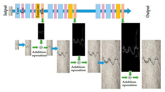 We used the method of Lai et al. [24] to up-sample the distorted image and used the loss function. The output of each transposed convolution layer was connected to two different layers: