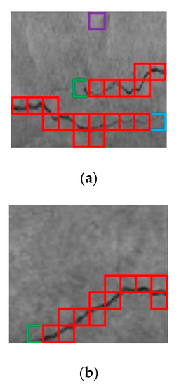(a) Two separate cracks and (b) a continuous crack. The red box was the normal crack patch, and green and blue represent the left end and right end, respectively. Purple was an isolated crack patch; therefore, it was excluded.