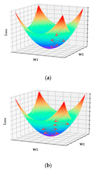 Our system consisted of two parts. One was the regression part of the distortion correction and up-sampling, and the other was the patch crack recognition part guided by the ground truth. We set up a loss function based on mean squared error (MSE) for pixel correction to show the change of the corresponding relationship between pixels before and after the distortion included up-sampling. For the classified structure, in each patch, we simply used an L2 function to identify the crack. Furthermore, during the training process, the stochastic gradient descent (SGD, momentum = 0.9) with mini-batches of 64 samples was applied to update the weight parameters. When we trained one step, we froze the weight of the other branch. Until the performance was stable, we carried out the whole weight training. The distortion correction and up-sampling were complementary, as their fusion significantly improved both. As He et al. [27] proposes, the learning rate based on cosine attenuation should be used for image learning with high detail requirements. The learning rate was initially set to 10−2, and then decreased according to a fixed schedule. The rate was changed to 10−3 after 40k iterations, then to 10−4 after 60k iterations, and stopped after 80k iterations. Figure 14 shows the convergence under the state of variable learning rate, which could effectively avoid the zigzag phenomenon in the process of regression [28]. Table 6 shows the results of several steps in our system using different learning rates and optimizers.