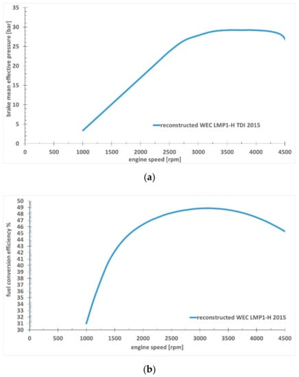 Reconstructed performance curves of a 2015 WEC LMP1-H TDI ICE. (a) BMEP vs. speed, (b) fuel conversion efficiency vs. speed.