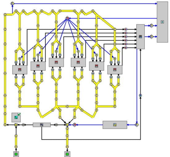 ICE performance simulations are performed by using state of the art computer codes of the operation of turbocharged and super-turbocharged diesel and diesel-LNG ICEs. Description of the modeling strategy and past application to dual-fuel diesel-alternative fuel engines are presented in [59,60,61,62,63,64,65]. Simulations have been performed for an engine fueled in one case with diesel only, and one case with diesel and LNG. Pollutant emissions are disregarded. Figure 5 presents a sketch of a V6 TDI CAE model, that allows simulation of the operation of turbocharged, electrically aided turbocharged and super-turbocharged ICEs, for CI operation.