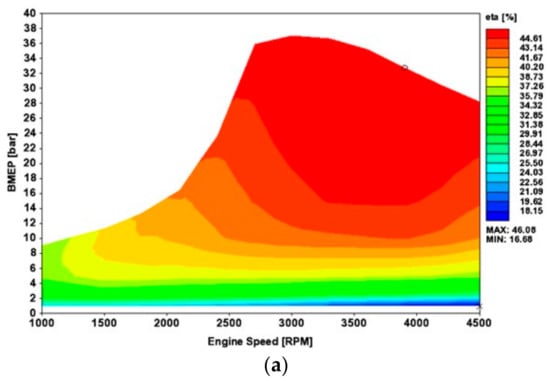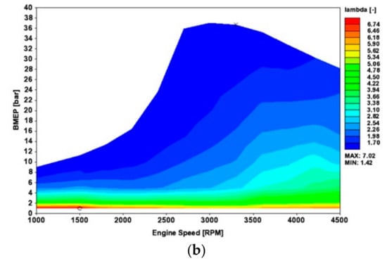 Figure 7 and Figure 8 present the computed η and λ maps of the super turbocharged and turbocharged diesel ICE, while Figure 9 and Figure 10 present the η, λ, and LNG energy/total fuel energy maps of the super turbocharged and turbocharged diesel-LNG ICE.