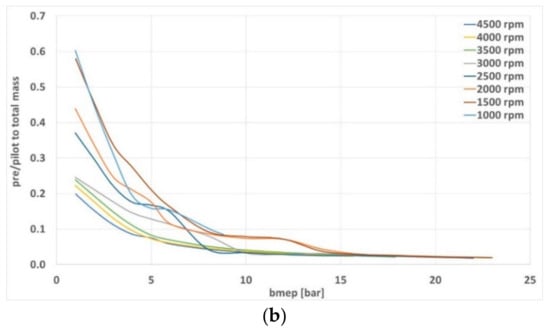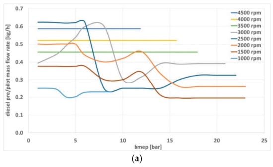 As shown by [68] studying a 2F diesel-LPG 1.6-L 4-cylinder ICE derived from a passenger car ICE, the amount of diesel needed in these operating conditions may be larger. As the baseline ICE model of the present study was developed targeting the high speed and load operation as customary in racing ICE applications, the low-speed low load definition of the pre/post injections was not of particular interest. The reference experimental definition of the pre/pilot mass flow rate of the small diesel 1.6 L is proposed in Figure 11.