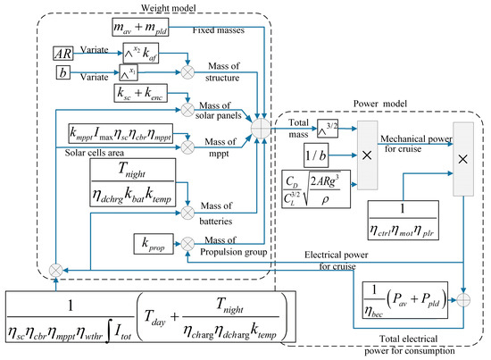 The total energy consumed during day and night flight can be obtained by the aerodynamic model and the weight model system. The closed loop of the energy balance is reconstructed by the weight model of each component. Figure 5 presents a detailed loop that visually represents the conceptual design process of the solar-powered UAV in this paper.