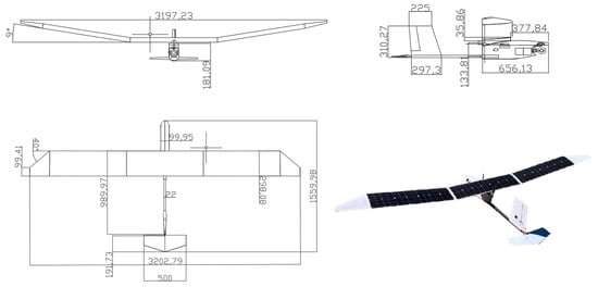 The main wing, with a 3.2 m wingspan, can be split into three segments of similar size to facilitate transport. The aileron-free design of the rectangular wing ensures the wing’s integrity, which increases the proportion of solar cells laid (14 units of solar cells laid as two rows on each wing segment). The outer wing has a dihedral angle of 9 degrees to improve the lateral stability of the aircraft. The layout characteristics are summarized in Table 3.