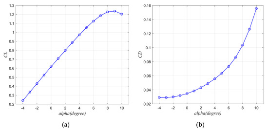 Figure 8 shows the change of aerodynamic parameters of the aircraft with the angle of attack. When the UAV cruised at an altitude of 5000 m at a speed of 10.5 m/s, the maximum lift-to-drag ratio was 18.4, which was obtained at 2 degrees of angle of attack, which was consistent with the UAV’s trim angle of attack. At the trim angle of attack, the lift coefficient of the UAV was about 0.8 and the stall angle of attack was about 9 degrees.