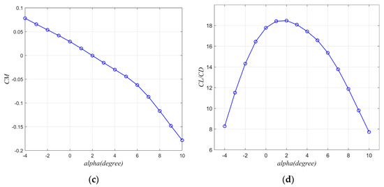 Computational Fluid Dynamics (CFD) result of cruise at 5000-m altitude of the UAV: (a) Lift coefficient, angle of attack data; (b) drag coefficient, angle of attack data; (c) pitching moment coefficient, angle of attack data; (d) lift–drag ratio data.
